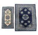 To Peking tæpper, design med symboler, ornamentik, blomster og bladværk på lys og blå bund. Kina. 20. årh. 145×76 og 178×131. (2)