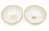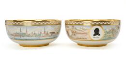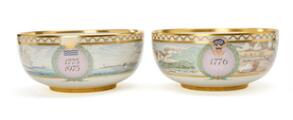 Two enamelled and gilt porcelain jubilee bowls comprising Royal Danish porcelain Facory 1775–1975. 27/2500. And The American Revolution 1776–1976. 107/2500. Royal Copenhagen. Diam. 34 cm. (2)