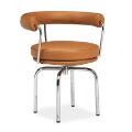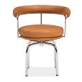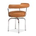 “LC 7”. Armstol af forkromet stål med drejefunktion. Sæde, ryg og armlæn betrukket med cognacfarvet skind. Formgivet 1929. Udført og stemplet hos Cassina.