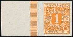 1922. 1 øre, orange. UTAKKET MÆRKE med fuld arkrand (pos. 31). Perfekt kvalitet. Oplag kun 100 stk. AFA 5.000. Attest Nielsen [ 9 ] [ (*) ]