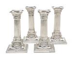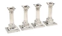 Fire victorianske stager af sterlingsølv, smedede i form af korinthiske søjler, Martin, Hall & Co (Richard Martin & Ebenezer Hall), London 1891 og 1893. H. 17 cm. Udfyldte. (4)