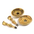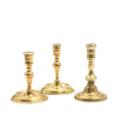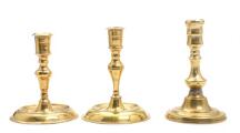 Three 18th century patinated brass candle stick holders H. 12.5–14.5 cm. (3)
