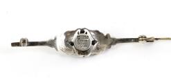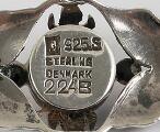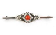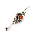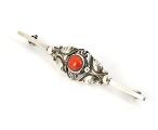 Koralbroche af sølv prydet med bladværk og cabochonslebet koral. Dessin 224 B. Vægt ca. 5 g. L. 6,2 cm. Georg Jensen 1933–44.