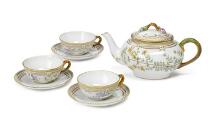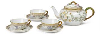 “Flora Danica” tekande og tre par tekopper af porcelæn, dekoreret i farver og guld med blomster, hanke i form af snoede grene. 3631 og 3630. Royal Copenhagen. (4)