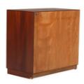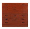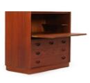 Teak bar/chest of drawers, front with two large and three minor drawers. Foldable leaf behind which storage compartment. Manufactured by Søborg Møbelfabrik. H. 83. W. 90. D. 48 cm.