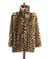 Pels af leopard med snøre i taljen, to-vejs lynlås og stiklommer. Udvendig ærme L. 68. Midt bag L. 84. Str. ca. 38.