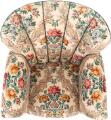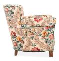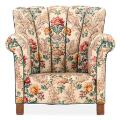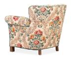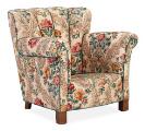 Easy chair with legs of patinated beech, upholstered with floral fabric.