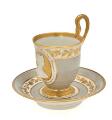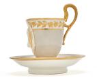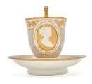 A German Empire commemorative and decorative cup with associated saucer, decorated in grey and gold on white ground with leafy tendrils, snake handle, the front of the cup with a cartouche and therein a bisquit profile portrait of Queen Louise of Prussia, surrounded by the text: “Sie lebt auf immer in den Herzen treuer Patrioten”, the saucer painted with the Queen's data: “10. Maerz 1775–19. Julii 1810”. Königliche Porzellan Manufaktur in Berlin, 1810s. H. cup (incl. handle) 11.5 cm. Diam saucer 14 cm. H. total 13 cm.