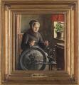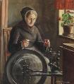 Interiør med kvinde ved en rok. Signeret A. M. Hansen 1894. Olie på lærred monteret på plade. 28×25 cm.