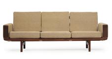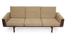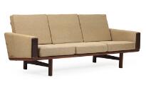 “GE 236”. Three seater solid teak sofa, armrests and loose epeda cushions upholstered with grey wool. Model GE 236/3. Designed 1955. Manufactured and marked by Getama, Gedsted. L. 210 cm.