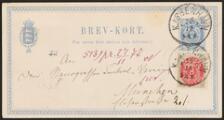 1870/1875. SKILLIN/ØRE mixed franking. Stationery card, 2 skilling blue uprated with 8 øre, grey/red. Sent from København 25.11.1877 to Germany (2 øre over paid). Very rare skilling/øre item sent abroad. ONLY KNOWN COPY with this combination. Mentioned in Karsten Jensen list [ 25 ] [ ✉ ]