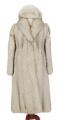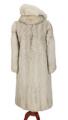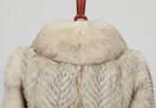 Polarræv frakke med krave, hægtelukning, lommer, tilhørende hat og lyst satin for. Ærmelængde ca. 65 cm. L. bagpå midtfor ca. 118 cm. Str. 38. (2)