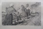 Woman and children by burning house. Signed Luplau Janssen. Lead on paper, fixed on cardboard. Sheet size 17.5×25.5 cm.