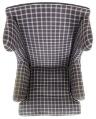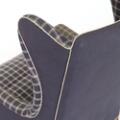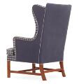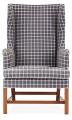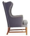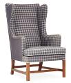 Øreklapstol med stel af mahogni. Betrukket med originalt blåt samt blåternet Cotil uld. Model 6212. Formgivet 1941. Udført hos Rud. Rasmussens Snedkerier.
