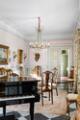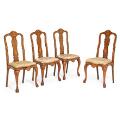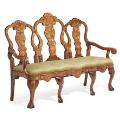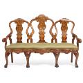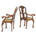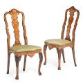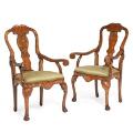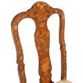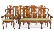 A Dutch set of floral marquetry seat furniture, mahogany inlaid with light wood, consisting of a three-seater sofa, a pair of srm armchairs, a pair of chairs and four chairs. Late 19th century. (9)