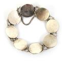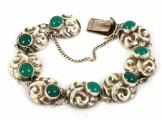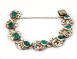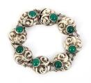 Armbånd af sølv med stiliseret ornamentik prydet med cabochonslebet grøn plast. Vægt ca. 23 g. B. 19 mm. L. 19,5 cm.