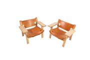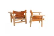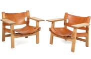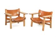 “Den spanske stol”. Et par armstole af massiv eg, sæde og ryg udspændt med patineret cognacfarvet kernelæder. Model 2226. Formgivet 1958. Udført hos Fredericia Stolefabrik. (2)