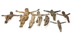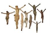 Eight various carved wood figures of the crucified Christ a few with remains of paint, two figures lacking their arms. 15th-19th century. H. 26–57 cm. (8)