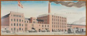 “Nordisk Fjerfabrik A/S - Projekteret Nybygning i 1926” (Projected new construction). Signed monogram. Pencil, watercolour and gouache on paper. Visible size 59.5×144.5 cm.