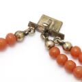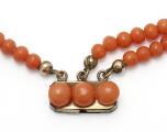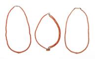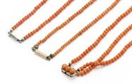 To koralhalskæder i forløb samt tre-radet koralarmbånd prydet med talrige koralperler og låse af sølv og delvist forgyldt metal. L. 18, 46 og 46,5 cm. (3)