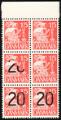1940. 20/15 øre, type II. Postfrisk 6-blok med DELVIS MANGLENDE OVERTRYK og HELT MANGLENDE OVERTRYK. Sjælden. Attest CAM. [ 264 ] [ ** ]