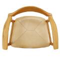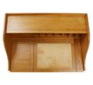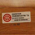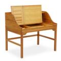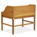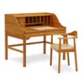 Fritstående skrivebord af massivt kirsebærtræ, front med opbevaringsrum samt tre skuffer, bordplade forsynet med tredelt skriveklap, midterfelt beklædt med brunt skind samt armstol med sæde af brunt skind. Udført og mærket hos Hadsten Møbelindustri. H. 73/104. L. 112. B. 82. (2)