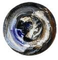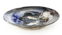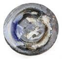 A circular earthenware dish modelled with relief decor. Decorated with brown, black, blue and and white. Signed Jeppe Hagedorn-Olsen. Unique. H. approx. 7 cm. Diam. 35.5 cm.