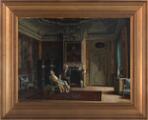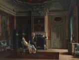 Interiør fra Fredensborg Slot med en fornem herre, der skal barberes. Sign. Adolf Heinr-Hansen 89. Olie på lærred. 49×65.