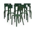 Rundt bord af bøg med top af lys laminat, samt seks stole af grønlakeret formbøjet bøg. Model 66. Designet 1935. Udført hos Artek. H. 71. Diam. 127. (7)