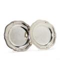 Et par franske tallerkner af sølv, med fliget, profileret fane. Mester Jacques Charles Mongenot, Paris 1781–1783. Eksport stempel 1781–1792. Vægt 1438 gr. Diam. 27 cm. (2)