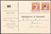 1905. 5 øre, 2.print. Pos. 11–12. pair with imperforated W-margin and perf. on all 4 sides on excellent parcel-card to Godhavn. with 3-line purple canc. “STYRELSEN AF KOLONIERNE I GRØNLAND”. Most rare card in very beautiful condition. AFA 22.000+ [ 2A,2A1 ] [ ✉ ]