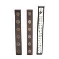 Three Chinese wooden paperweights, the two embellished with coins of the 12 Chinese zodiac signs, the other with inscription on imitated bone. 20th century. L. 30 og 32 cm, respectively. W. 4 cm. (3)