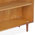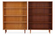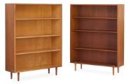 To bogreoler af teak med senere ben af bejdset bøg. En reol indvendig af bøg. Udført hos Søborg Møbler. H. 131,5. B. 100. D. 32. (2)