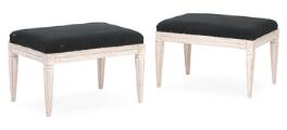A pair of Swedish banquettes of white painted wood. Gustavian style, 20th century. H. 48 cm. L. 65 cm. W. 49 cm. (2)