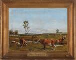 Landscape with grazing cows and sheep. Farum, 1861. Signed on the reverse Fritz Jürgensen. Oil on canvas. 25×33 cm.