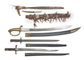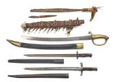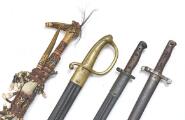 Dansk livgardesabel M/1854 i nyere skede mærket LG. 585 på parerbøjlen med ca. 58,5 cm. lang klinge, en engelsk bajonet M/1907 i skede, en portugisisk bajonet M/1885 i skede samt en nyere Mandau med bemalet greb i horn og ca. 44 cm. lang klinge in bemalet skede dekoreret med tænder. (4)