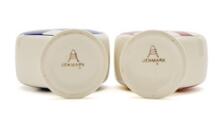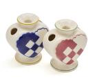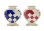 To julehjertestager af fajance, dekoreret i henholdsvis blå og rød. Aluminia. H. 8 cm. (2)