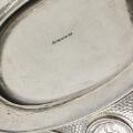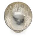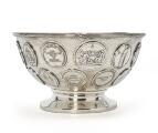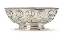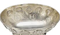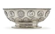 A German hammered silver bowl, of oval form, fluted top rim with cross-over bands, domed base, overall richly inserted with medals from among others Denmark and Germany with portraits, inscriptions and coat of arms. D. Vollgold & Sohn, Berlin, fineness 800. C. 1900. Weight 1,838 g. H. 13 cm. L. 33.5 cm. W. 24 cm.