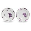 Et par dybe tallerkener af porcelæn, dekoreret i grønt og mangan med blomster og kæmninger. Den Kongelige Porcelainsfabrik, ca. 1780. Diam. 22 cm. (2)