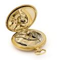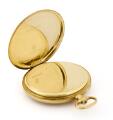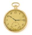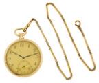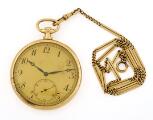 Pocket watch of 18k gold. Mechanical movement with lever escapement and crown winding. Golden dial with blued steel hands. Dust cap of 18k gold. Ø 49 mm. The watch weighs approximately 69.6 grams. Chain of 14k gold. This weighs approximately 12.3 g and measures approximately 41 cm. 1910–20s.