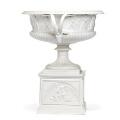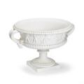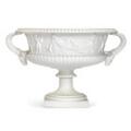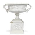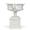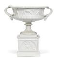 A biscuit Medici form vase with neoclassical relief band depicting Silenius surrounded by putti playing music, handles moulded like ram's heads and meandering horns H. 26.5 cm. A square plinth with reliefs H. 15 cm. The Royal Copenhagen Factory, 19th century.