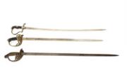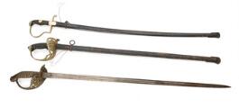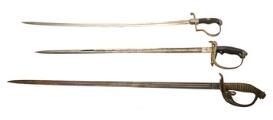 3 tyske sabler omkring 1889. En nysølvmonteret prøjsisk kavalleripallask M/1889 med greb i kunststof, kurv med den prøjsiske ørn og ca. 75,5 cm. lang enægget klinge ætset på næsten hele fladen med bl.a. HUS. REG. KöNING WILHELMINA d. NIEDERLANDE (HANNOV.) NR 15 samt PENINSULA, WATERLOO, EL BODON og BAROSSA i sortmalet jenskede med enkelt bærering, prøjsisk messingfæstet kavalripallask M/1889 med ca. 86 cm. lang klinge samt en tysk forniklet artillerisabel efter M/1889 med greb i kunststof og spinkel forniklet ca. 81 cm. lang klinge i sortmalet læderskede med enkelt bærering. (3)