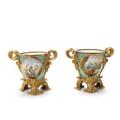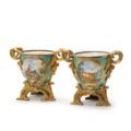 Et par franske vinkølere af porcelæn, dekoreret i farver og guld med fugle og vildt i kartoucher, med montering af forgyldt bronze. Sevres mærke. 19. årh. H. 21,5 cm. L. 25 cm. (2)