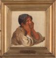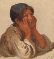 A boy lying with his head in his hands. Study. Signed C.H. Oil on paper laid on canvas. 16.5×15.5 cm.