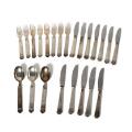 “Rådhus” bestik af sølv mærket Haandsmedet samt Københavns bymærke. Bestående af tre suppeskeer, otte middagsgafler, fem frokostknive samt syv middagsgafler. Vægt 686 gr. (ex. knive) (23)
