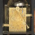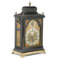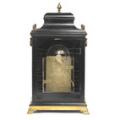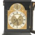 An English George III table clock in case of black painted wood, dial of gilt brass with openwork corner ornaments of gilt bronze, silvered timber wreath with black numerals, movement with calendar and strike-silent. Signed. John Tayler, London. 18th century. H. 58. W. 32. D. 12.