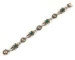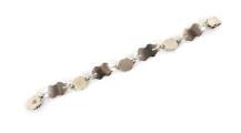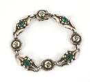 A chalcedony bracelet in the shape of flowers and foliage set with cabochon chalcedony, mounted in partly hammered sterling silver. Design no. 18. Weight app. 21.5 g. W. 13 mm. L. 19 cm. Georg Jensen after 1945.