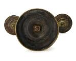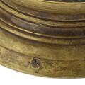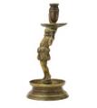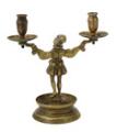 A Renaissance figure candlestick of brass, stem cast and chiseled in the shape of a knight holding two candle trays/drippans, these later mounted with candle pipes; on a round, profiled base. Germany 15th century. H. 26 cm