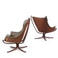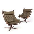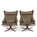 “Falcon”. A pair of easy chairs with frame of stained beech, stretched with canvas, loose button fitted cushions upholstered with grey/brown leather. Manufactured by Vatne Møbler. (2)