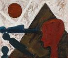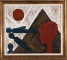 “Jeg bliver til stjernen over alle stjerner”. Sign. på bagsiden Peder Brøndum Sørensen, 1975. Olie på lærred. 65×75.